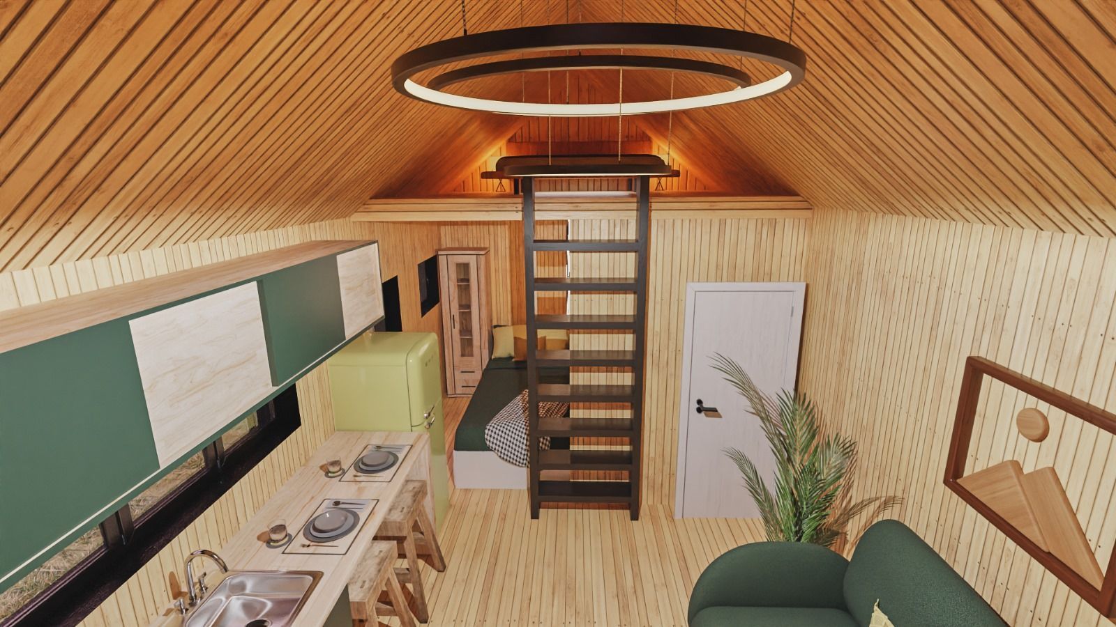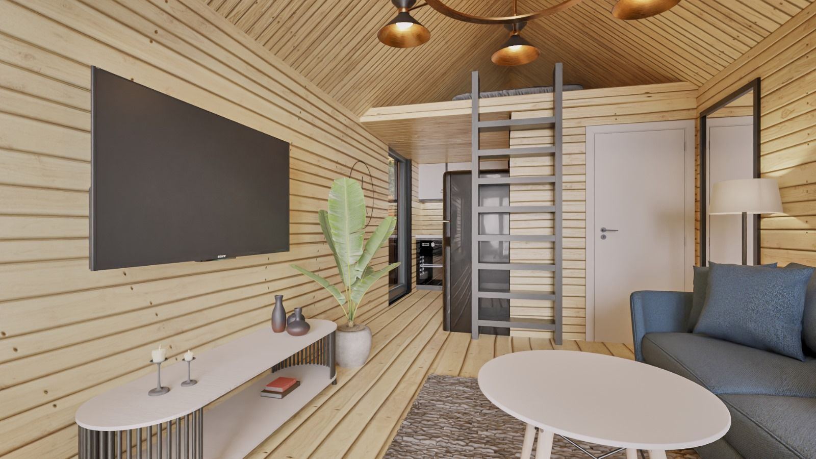 Dieses unser kleinstes Niedrigenergiehaus mit einer Fläche von 25 m2 bietet allen Komfort für modernes Wohnen. Das Schlafzimmer befindet sich in einer Maisonette-Wohnung, das Haus verfügt über eine Sandwich-Isolierkonstruktion und hochwertige dreifach verglaste Fenster für hervorragende Wärmedämmung. Die Innenwände sind mit einer 28 mm starken Holzverkleidung verkleidet, die dem Innenraum ein natürliches Aussehen und eine gemütliche Atmosphäre verleiht.